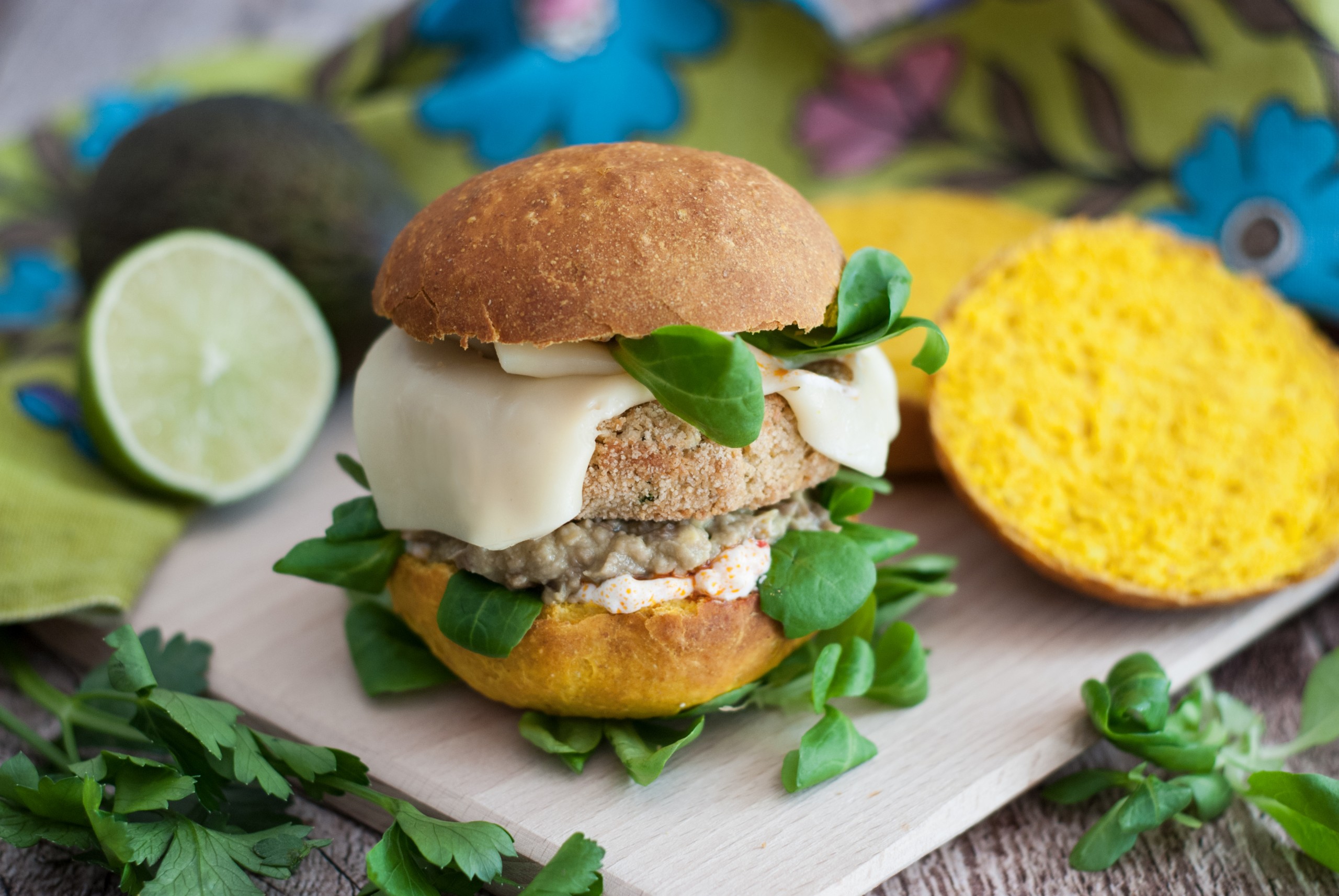 A questo punto potete preparare i vostri burger. Tagliate a metà il panino alla curcuma.